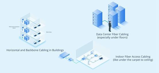 Los cables de conexión de fibra óptica blindados tienen las características de resistencia a la tracción, resistencia a la compresión, resistencia a mordeduras de roedores y resistencia al daño al pisar. También se pueden utilizar en ambientes exteriores hostiles donde hay mucho polvo o daños por parte de roedores. La siguiente figura muestra tres escenarios de aplicación de cables ópticos blindados en aplicaciones interiores.